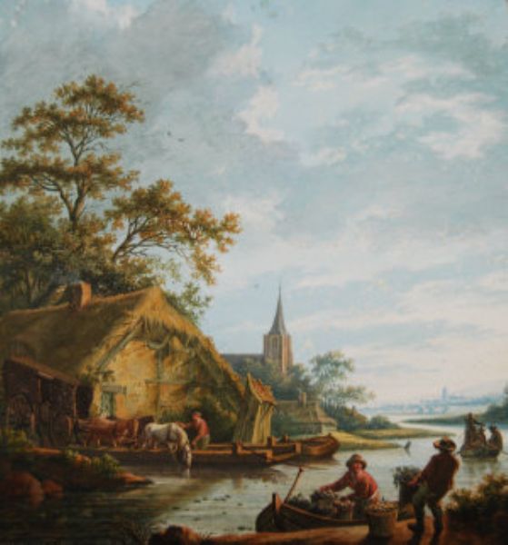 ruit and flower merchants loading their boat on a tranquil river with horses watering on a pontoon awaiting the ferry, with dist