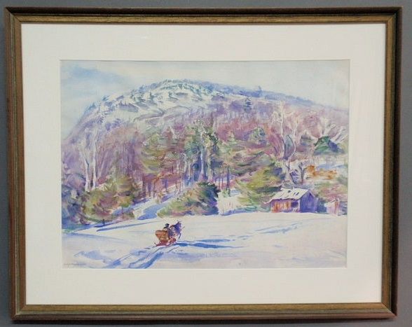 | A snow scene with a horse drawn sleigh and a wooded mountain background | |