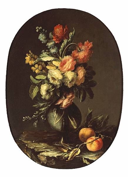 | A still life of flowers in a vase along with two peaches on a ledge; also a companion still life | |