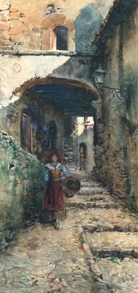 Vicolo di paese con figura femminile in costume
