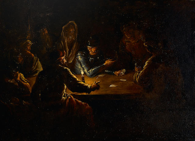 | A soldier in armor and others playing cards at a table by candlelight | |