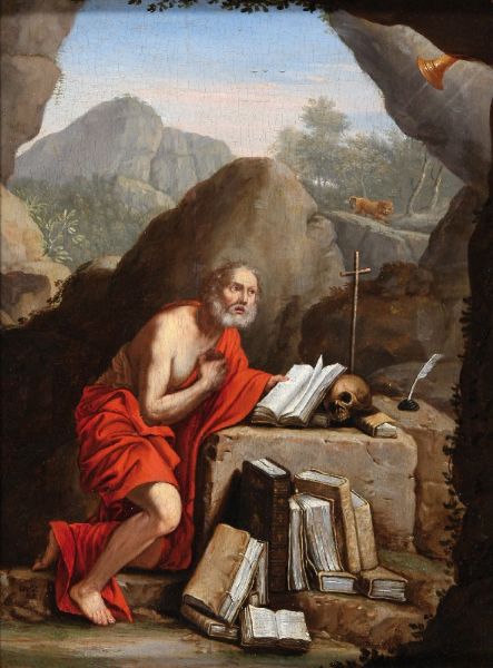 | Hilly landscape, in the foreground Saint Jerome kneeling in front of a stone altar with a skull and some books | |