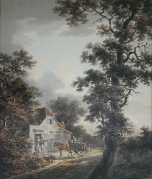 A HAY CART BY A COTTAGE ON A COUNTRY LANE