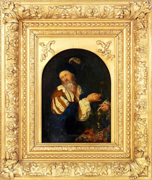 | A BEARDED MAN HOLDING A GLASS OF WINE, WITH A PEWTER JUG BY HIS SIDE | |