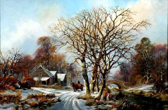 Winter Snow Scene with Figures by a River near a Farmhouse