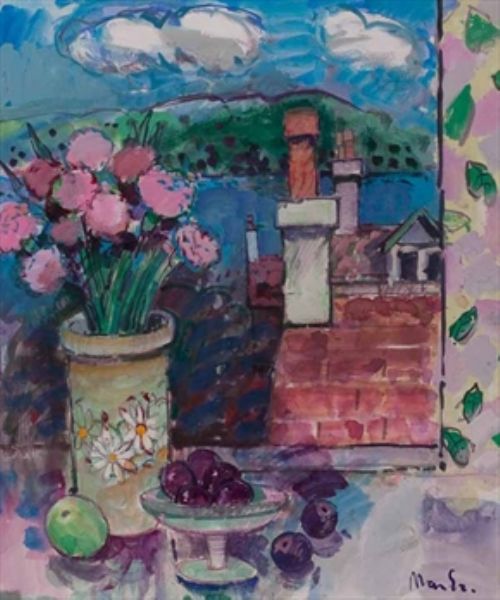 STILL LIFE WITH ROOFTOPS AND DISTANT ESTUARY