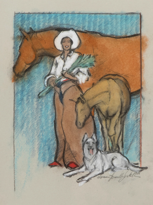 Cowgirl with horse, colt and dog