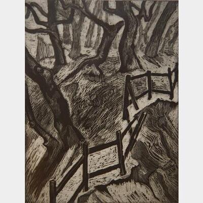 ''Dead Trees''- aquatint, 1936, signed and titled in pencil, stamped 'Federal Art Project #1', very good condition; together with an etching by Gerry Pierce of Cleveland. 11 x 8 1/2'' | |