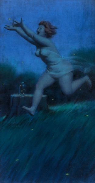 Hilda Chasing Fireflies at Nightfall, Brown & Bigelow calendar illustration