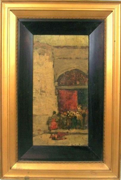 | a Middle Eastern crowd scene, with a fallen figure to the foreground and a mob following | |