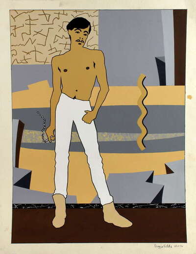 Duggie Fields, b.1945, full length male portrait, white jeans and cowboy boots, signed and dated in the margin, 28.11.74, 61cm x 45.5cm, | |