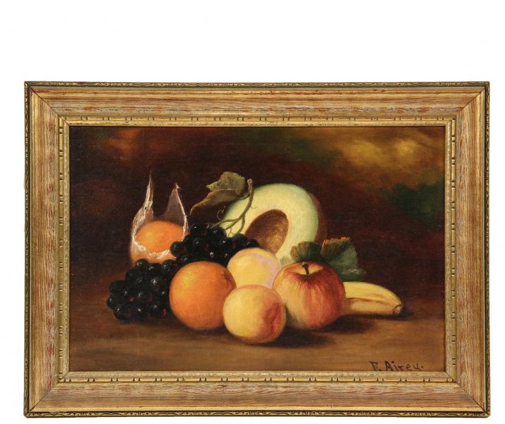 | Still Life of Fruit including halved melon, wrapped orange, concord grapes, peaches, apple and banana. | |