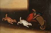 Terriers ratting under a wheelbarrow
