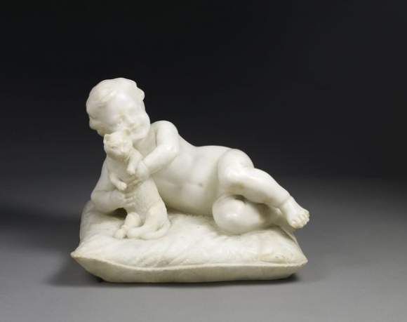 Jeune enfant tenant un chat sur un coussin damassé