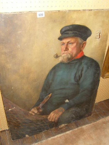 Portrait of a seated bearded fisherman smoking a pipe and mending a net