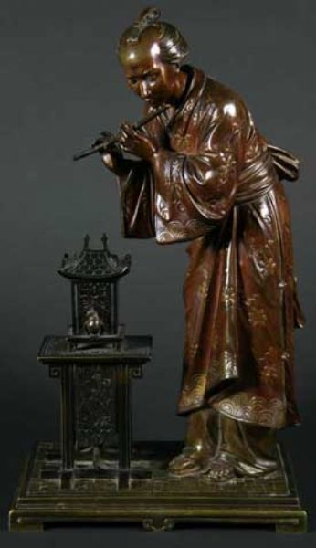 A Bronze Figure of a Japanese Musician, playing the flute to a bird in a cage, retailed by Raingo Frères