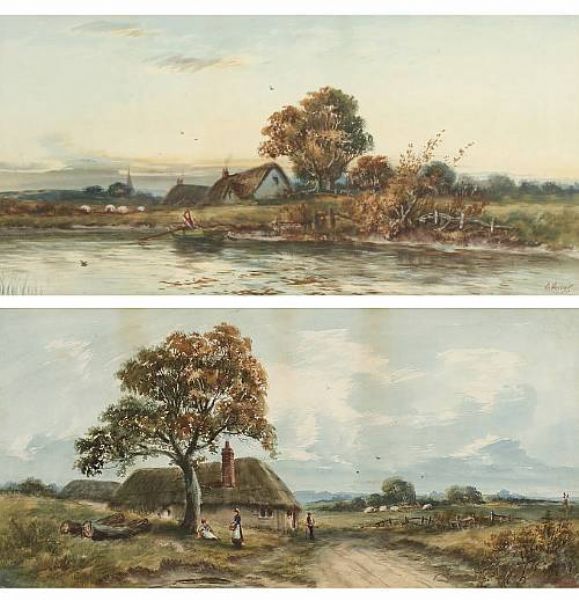 | Country landscape with cottage and figures, and another similar with figure and boat by a river | |