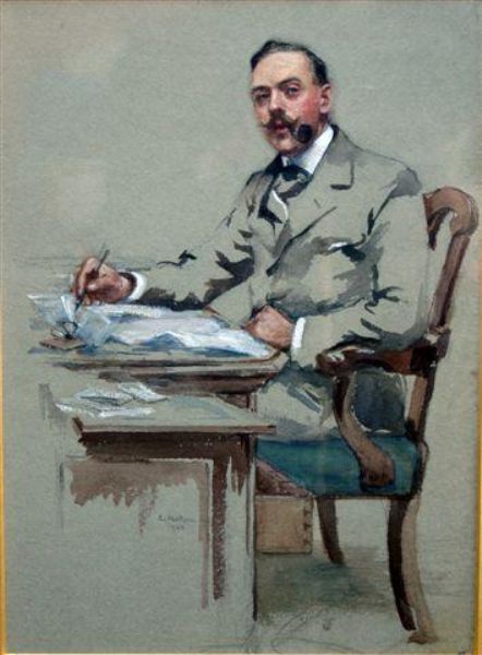 Portrait of Cecil Sebag Montefiore smoking a pipe at his desk