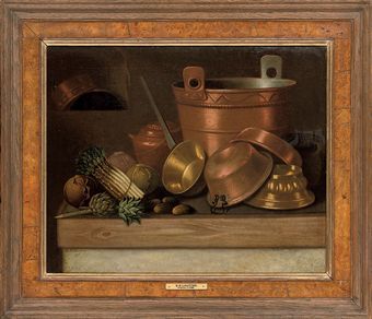 | Asparagus, cabbage, artichoke and pots on a table; and A basket of assorted vegetables and pots on a shelf | |