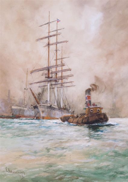 Merchant ships and a tug in a harbour
