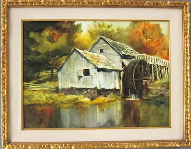 An autumn landscape with a mill and waterwheel.