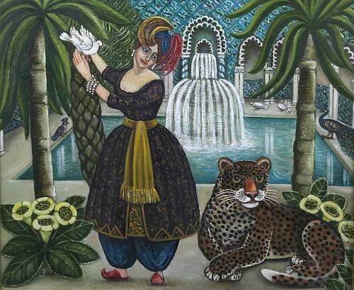 | 'The Favourite', a middle eastern lady and a leopard beside palm trees before a fountain and pool, Arthur Jeffress Gallery label | |