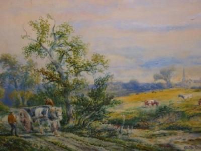 | Rural Scene with Horse and Cart on a Riverside Track, Cattle and Church Spire Beyond | |