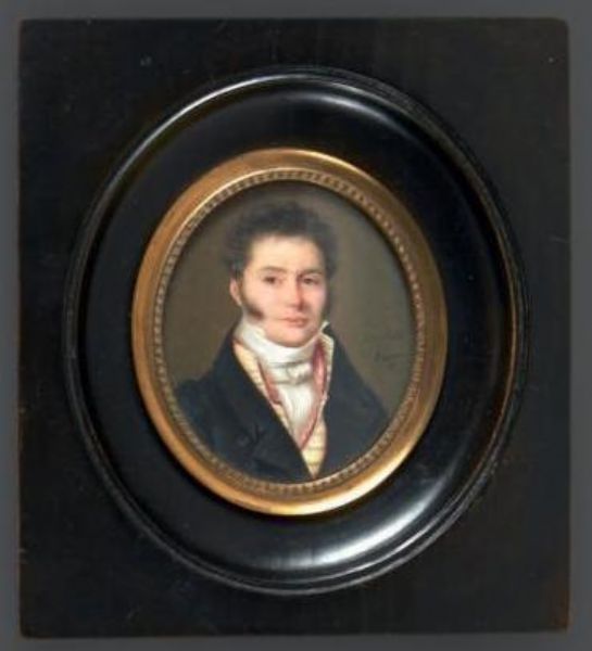 Portrait d'un jeune homme en redingote grise, gilet rayé jaune doublé de rose et cravate blanche