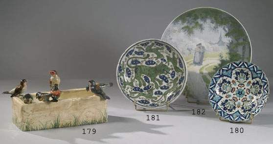 | Assiette décorative en céramique à bordure festonnée. Décor dans le goût Iznik, émaux polychromes (petits éclats en bordure). | |