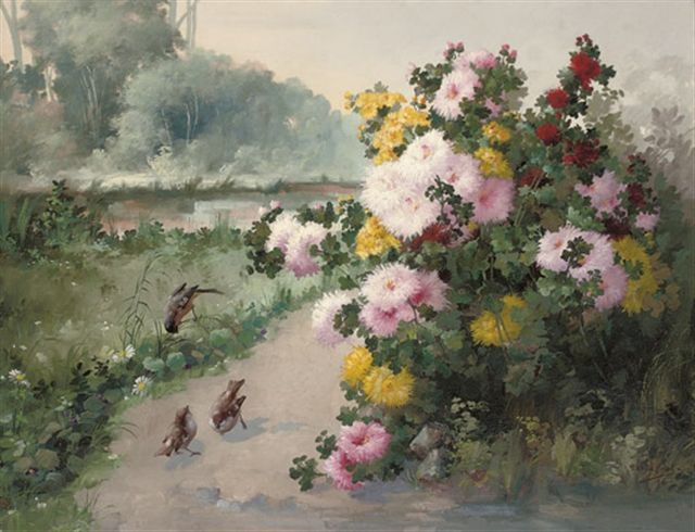 Sparrows by a chrysanthemum bush
