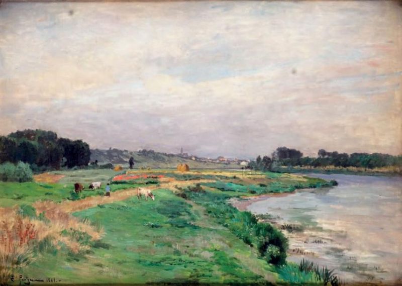 PAYSAGE DE L'EST DE LA FRANCE AVEC RIVIÈRE, BERGÈRE ET SON TROUPEAU