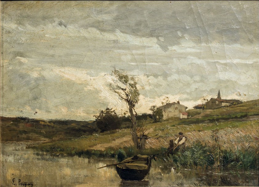 | Paysage de bord de rivière animé d'un pêcheur tirant sa barque. | |