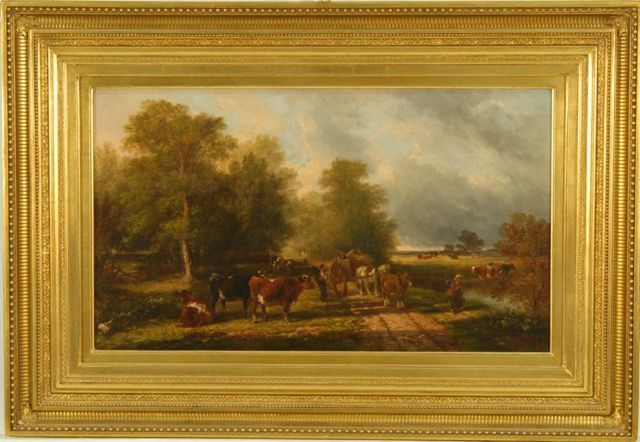 | Roadside landscape with cattle in a meadow and numerous figures near a hay wagon | |