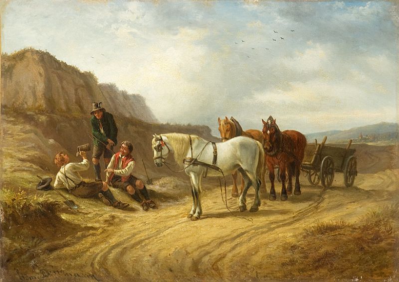 | Drei Burschen mit leerem Bierkrug auf Böschung sitzend. Drei wartende Pferde | |