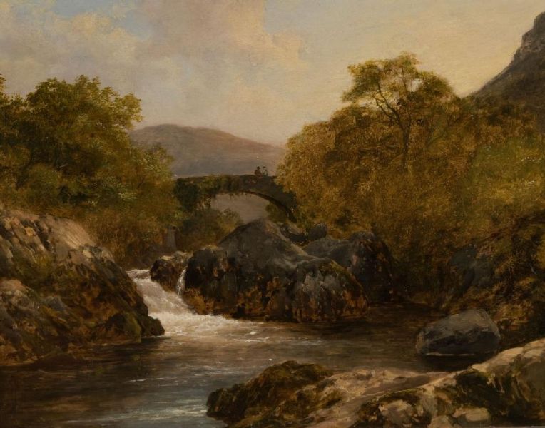 WATERFALL WITH FIGURES ON A BRIDGE BEYOND