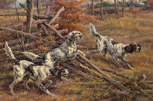 Three English Setters clearing a fence