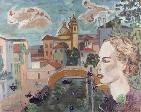 landscape of a Venice with a woman's head in the fore front