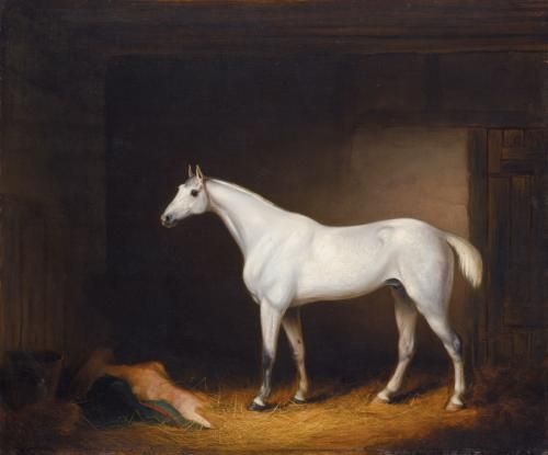 A GREY RACEHORSE IN A STABLE