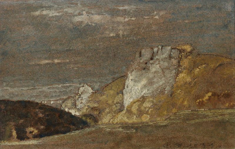 Gewitter. Hügelige Küstenlandschaft mit abziehendem Gewitter.