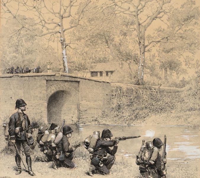| Infantry skirmish soldiers on the banks of a river and advancing the bridge - See more at: http://www.tennants.co.uk/Catalogue/L | |