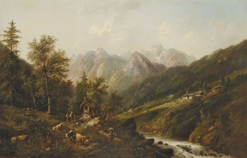 Gebirgslandschaft mit Bauern bei einer kleinen Kapelle