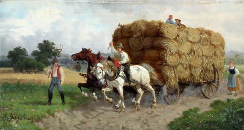 Een landschap met een hooiwagen met paarden en landarbeiders