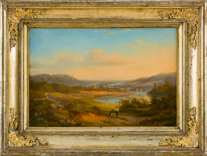 | Niederrheinische Landschaft im Abendsonnenschein. An den Ufern kl. Städte und Kirchen. Im Vordergrund rastende Wanderer | |