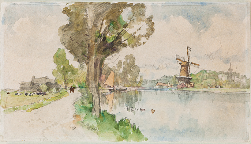 Flusslauf mit Weg und Mühle am gegenüberliegenden Ufer