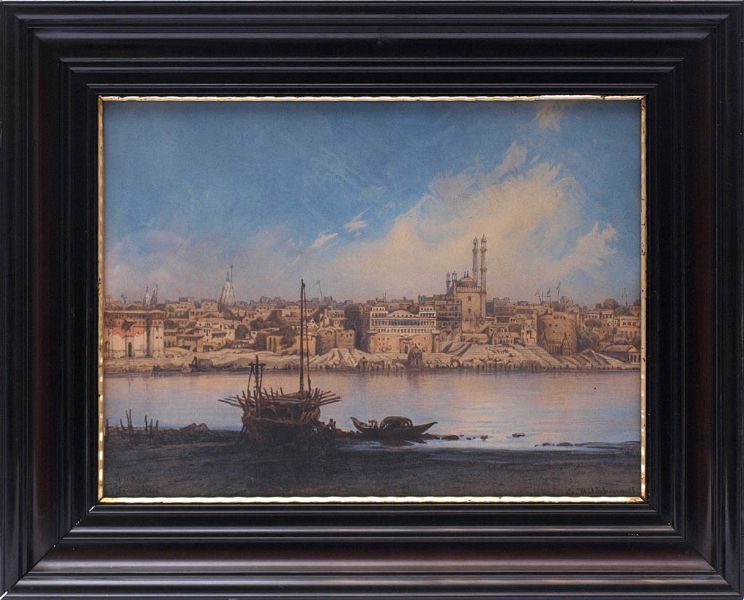 Blick auf Benares, im Vordergrund am Flussufer einige Fischerboote mit Figurenstaffage