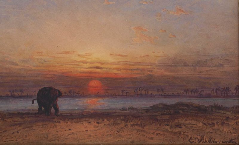 Einsamer Elefantenbulle am Ufer eines Flusses im Licht der untergehenden Sonne