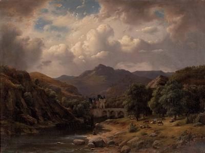 Burg, Hirtin und Angler in bewalderter Tallandschaft
