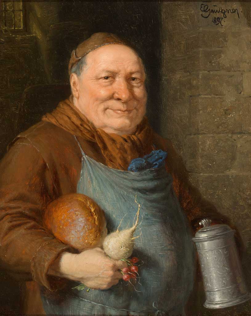 Portrait eines Mönches mit Bierkrug, Rettich und Brotlaib