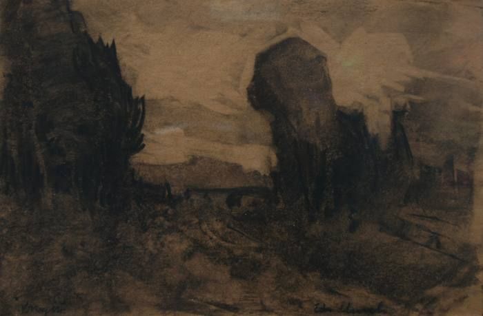 Gehöft in Baumlandschaft, im Hintergrund Segelschiffe