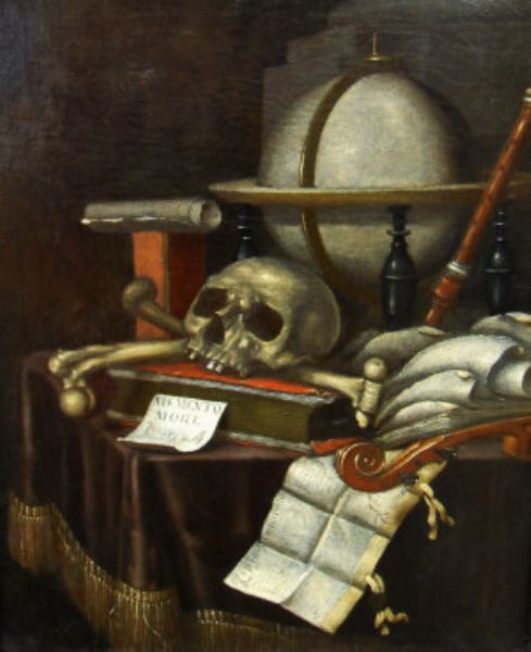 A Vanitas still life, with books, scrolls and a globe